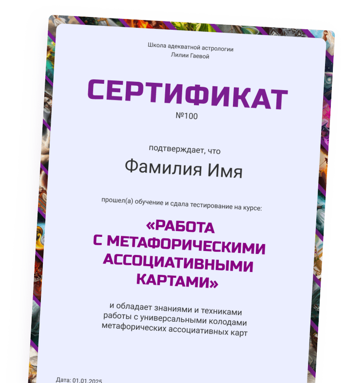 В подарок вы получите курс «Работа с метафорическими картами» с сертификатом о прохождении курса. Уроки записаны лично Лилией — астрологом, коучем, психологом и многолетним практиком по работе с МАК. Вы поймёте, как работать с картами самостоятельно. А также данная колода пригодиться вам при расшифровке натальных карт во время изучения астрологии.